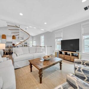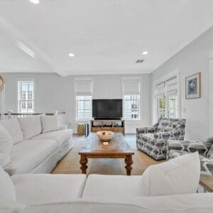 Upstairs, the bright and airy main living space includes a fully stocked kitchen with stainless steel appliances, bar seating for six, and a dining area for eight. The living room features two couches, a nook for additional seating, and a 65” TV with Sonos sound. Two large balconies extend from this level—one screened with Gulf views, the other oversized with abundant seating and views of both town and water. A third full bath is also located here.