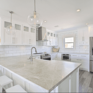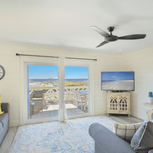 Shoreline 9 #1 is a freshly updated Inlet Beach retreat with Gulf views, modern finishes, and a layout designed for relaxation. The second floor holds the main living space, where an open kitchen connects seamlessly to the living room and a furnished balcony. The kitchen features quartz style counters, stainless appliances, a farmhouse sink, and custom cabinetry, making it easy to cook, entertain, and stay connected to the group. The living area includes a queen sleeper sofa for flexible sleeping arrangements.