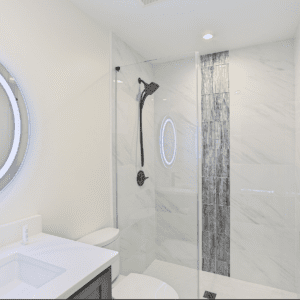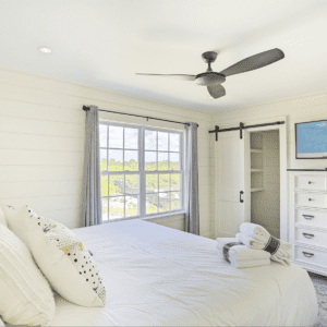 Upstairs, both bedrooms offer king beds, smart TVs, and private bathrooms with walk in showers. The primary suite opens to its own balcony, giving you a quiet spot to enjoy the breeze and morning coffee. Each bathroom is finished with sleek tile, contemporary vanities, and backlit mirrors for a clean, spa like feel. A stacked washer and dryer sit near the bedrooms for quick beach towel turnarounds.