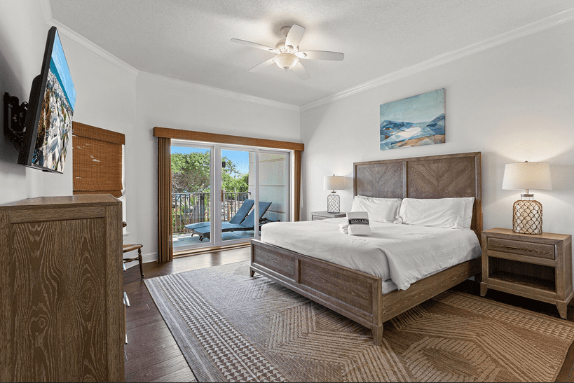 The main level features three guest bedrooms, one king, one queen, and a custom bunk room that sleeps four. each with its own private bath and balcony access. Upstairs, the master suite provides a peaceful escape with a king bed, sitting area, walk-in closet, jetted tub, and glass shower, all opening to a private porch overlooking the dunes and turquoise waters.