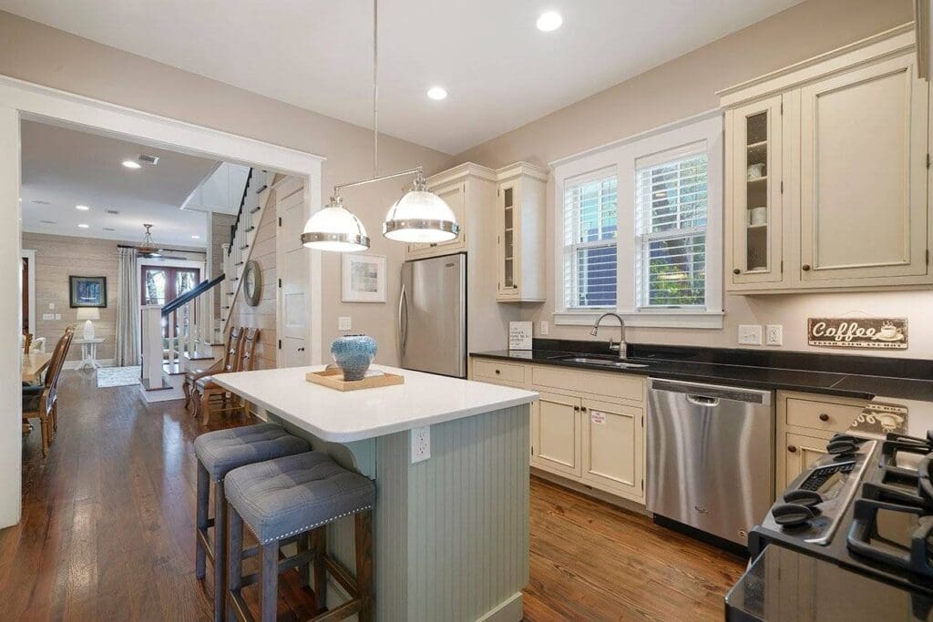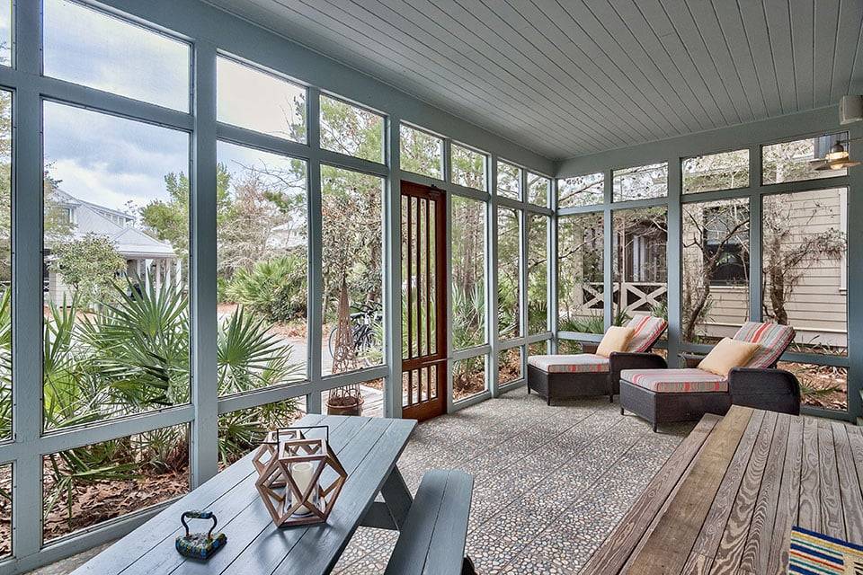 The kitchen is fully equipped with stainless steel appliances, granite countertops, and an island with bar seating. The dining area seats eight comfortably, and the living room provides plenty of space to unwind after a day in the sun. Outside, enjoy an outdoor shower, grill, and access to the Camp WaterColor pool just a short walk away.