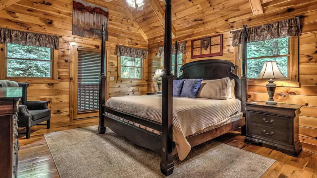 Each bedroom occupies its own level and includes a king bed, private bathroom, and access to a deck or balcony. The upper suite features a four-poster bed, 55-inch TV, and a walk-in shower, while the main and lower-level bedrooms provide similarly comfortable accommodations with tiled showers and double vanities.