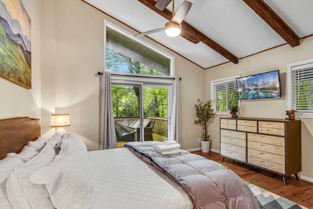 The main-floor primary suite includes a king bed, TV, deck access, and an en suite bath with a tub/shower combo. Downstairs, a queen suite and a twin room with trundles each offer private baths and access to the lower deck. The fenced yard makes the home especially inviting for guests traveling with dogs.