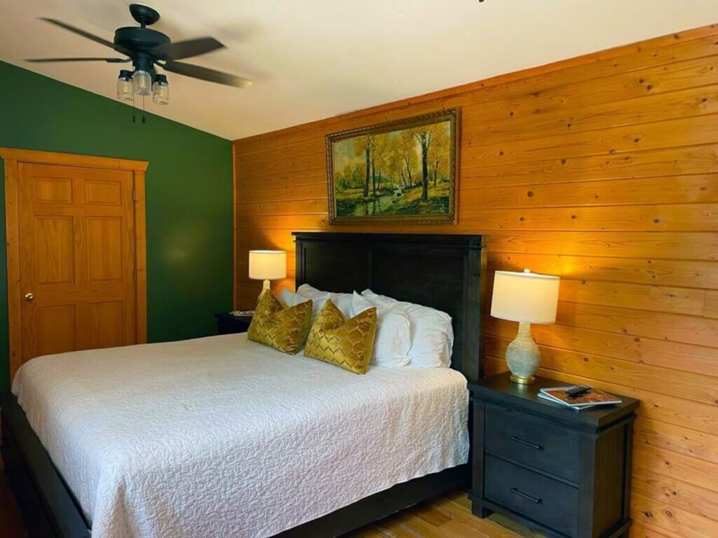 The downstairs bedroom offers a king bed, smart TV, and access to a full bathroom just steps away. Upstairs, a spacious suite provides another king bed, two twin beds, a smart TV, and a private en suite bath, creating an ideal setup for families or small groups seeking comfort and privacy.