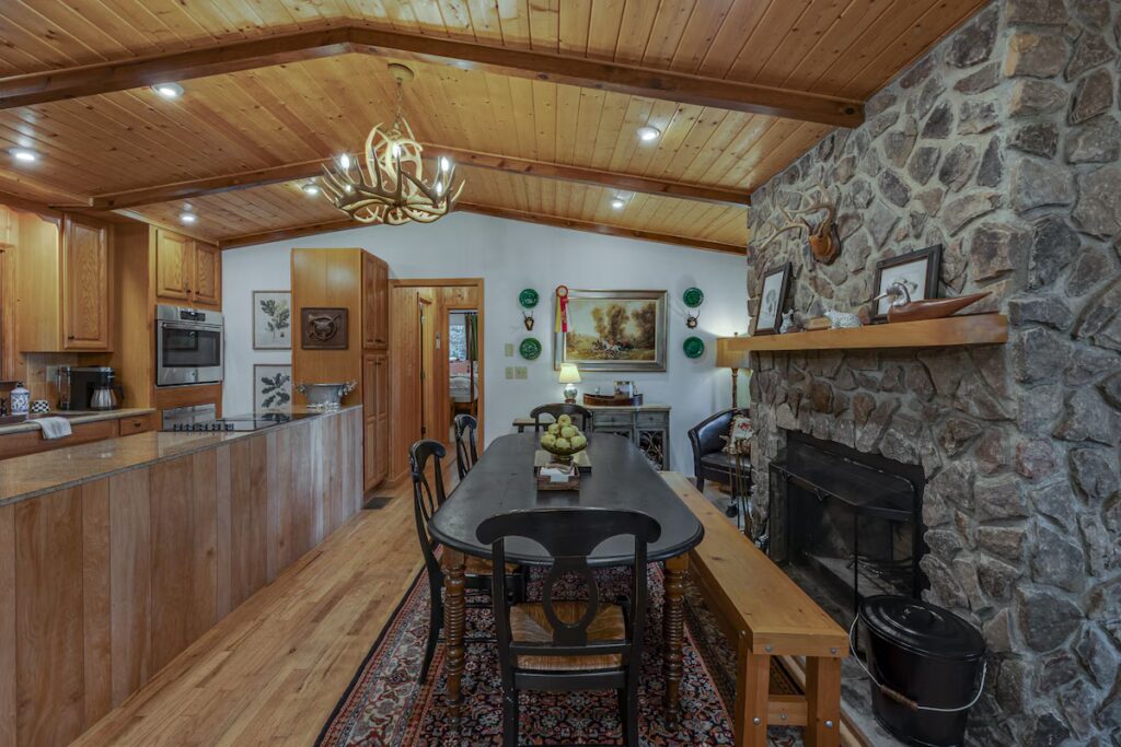 Outside, guests can enjoy abundant natural surroundings and convenient parking on the gravel drive. A 50-amp EV charger adds modern practicality for electric vehicle travelers. Tally-Ho sits less than half a mile from downtown, making it easy to reach Highlands’ dining, shopping, and trail access on foot.