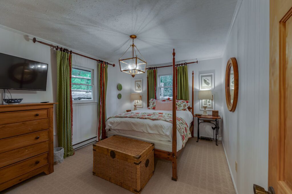 Set on a wooded hillside just a short walk from downtown Highlands, this split-level 4-bedroom, 2-bath cottage offers a quiet retreat with easy access to shops, restaurants, and local attractions. The main level features a cozy living area with seating for six, a wood-burning fireplace, and a 50″ 4K TV with Roku. A fully equipped kitchen and adjoining dining area provide everything needed for relaxed meals at home. Two queen bedrooms are located on this floor, each comfortably furnished for restful nights.