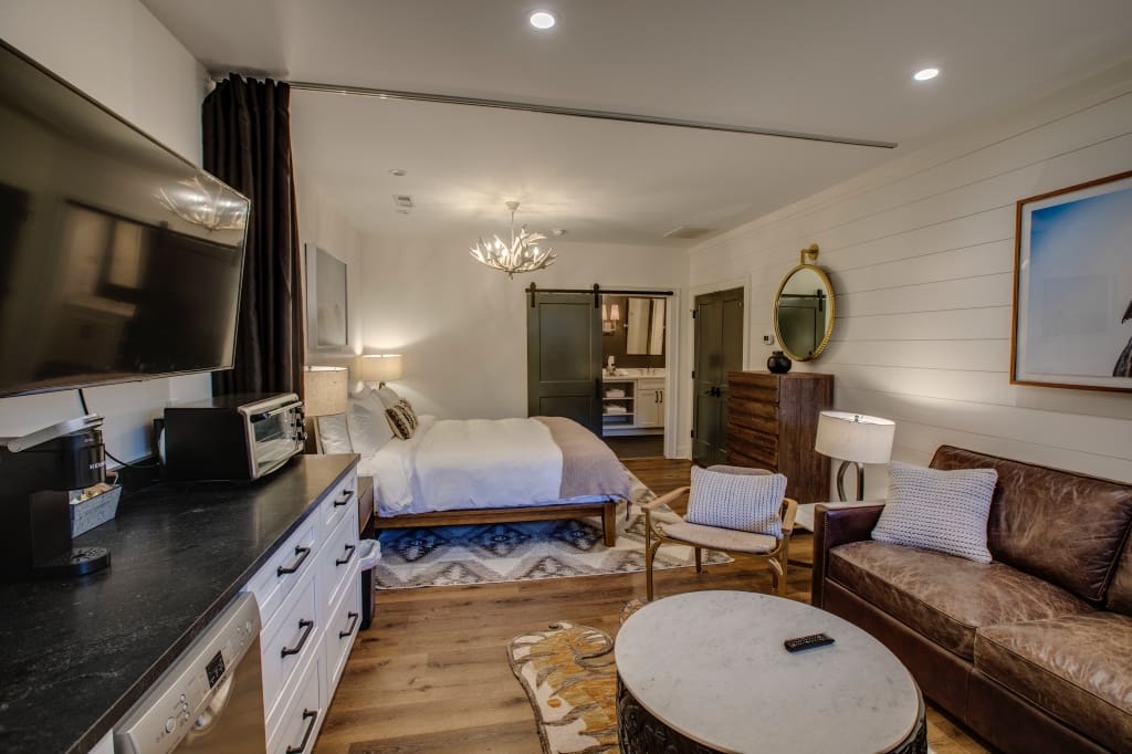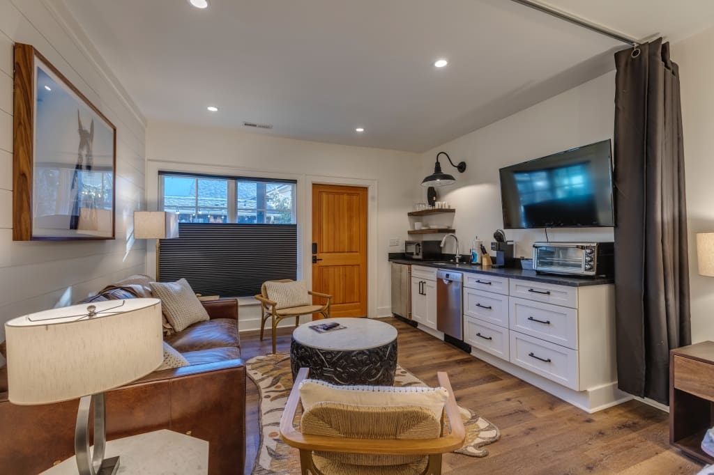 The Galax Room is a comfortable studio designed for two, offering a warm and modern space in the heart of Highlands. The king bed features soft linens and sits opposite a cozy seating area, while the kitchenette includes a Keurig, microwave, toaster oven, and dishwasher for simple in-room meals. The bathroom is finished with a double vanity, heated floors, and a spacious layout that adds an element of luxury to your stay. A private washer and dryer provide added convenience for longer visits.