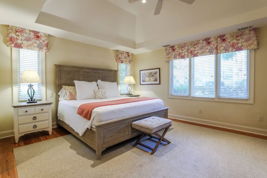 The first-floor primary suite includes a king bed, a tiled en-suite bath, and a 50″ smart TV. Upstairs, three guest bedrooms provide a variety of sleeping arrangements, including king and queen beds, a Twin XL, and multiple smart TVs, with two full bathrooms completing the layout.