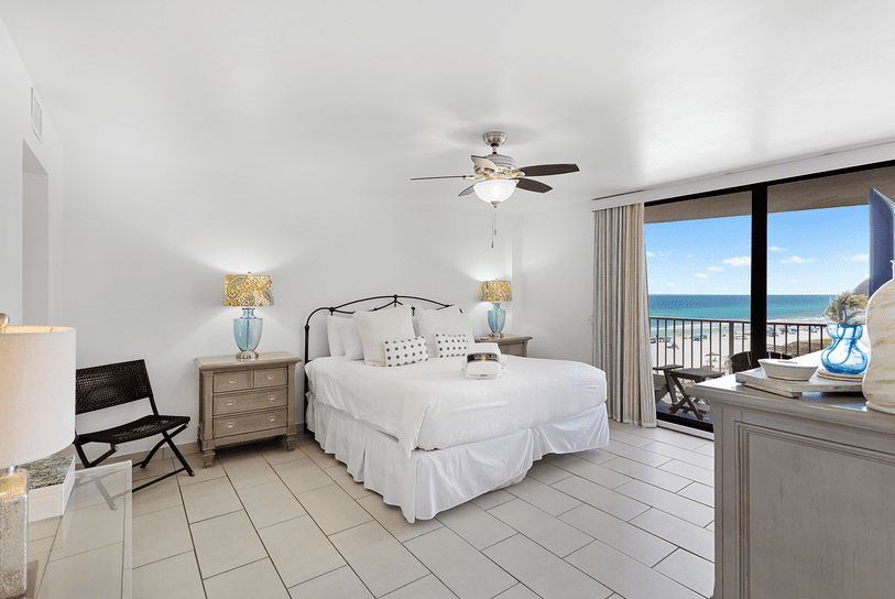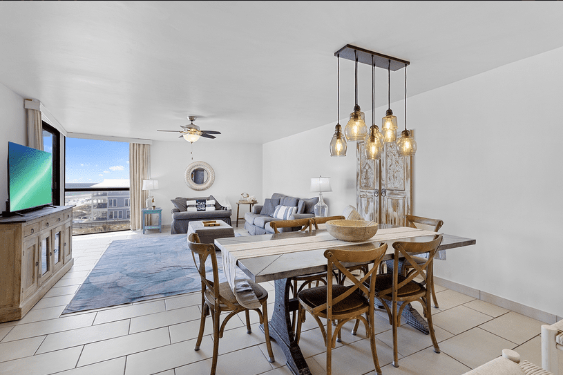 Perched on the fifth floor of the front building at the gated Mainsail Resort, this 2-bedroom, 2-bath condo offers sweeping Gulf views and a bright, coastal-inspired interior. The open living area features floor-to-ceiling glass doors, a plush seating ensemble, a Tempur-Pedic queen sleeper sofa, and a twin sleeper ottoman, creating flexible space for gathering and relaxation. The adjoining dining area seats six beneath warm pendant lighting, while the fully equipped kitchen includes granite counters, stainless-steel appliances, and a breakfast bar for four.