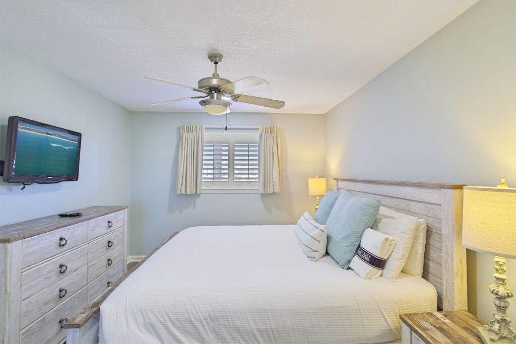 Upstairs, a spacious king loft overlooks the living area and includes a mounted TV and access to a full hall bath with a tub/shower combination. A second upper bedroom features four twin beds, creating a flexible layout for families and groups. The private balcony offers a relaxing place to take in Gulf breezes and enjoy the view.