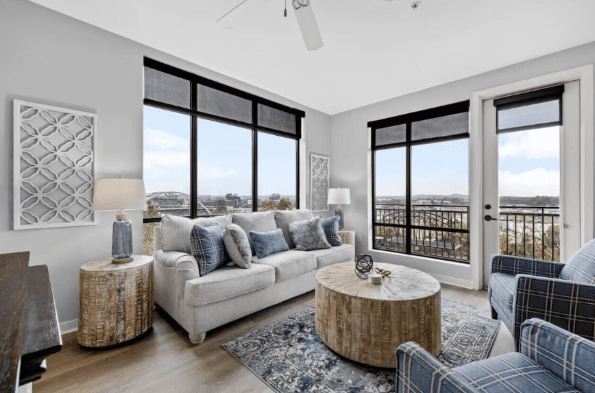 This remodeled 2 bedroom, 2 bathroom corner condo combines modern comfort with classic Nashville energy, offering sweeping views of the skyline and Cumberland River from its elevated bluff in SoBro. Floor to ceiling windows, stylish furnishings, granite countertops, and stainless steel appliances create a bright and polished retreat.