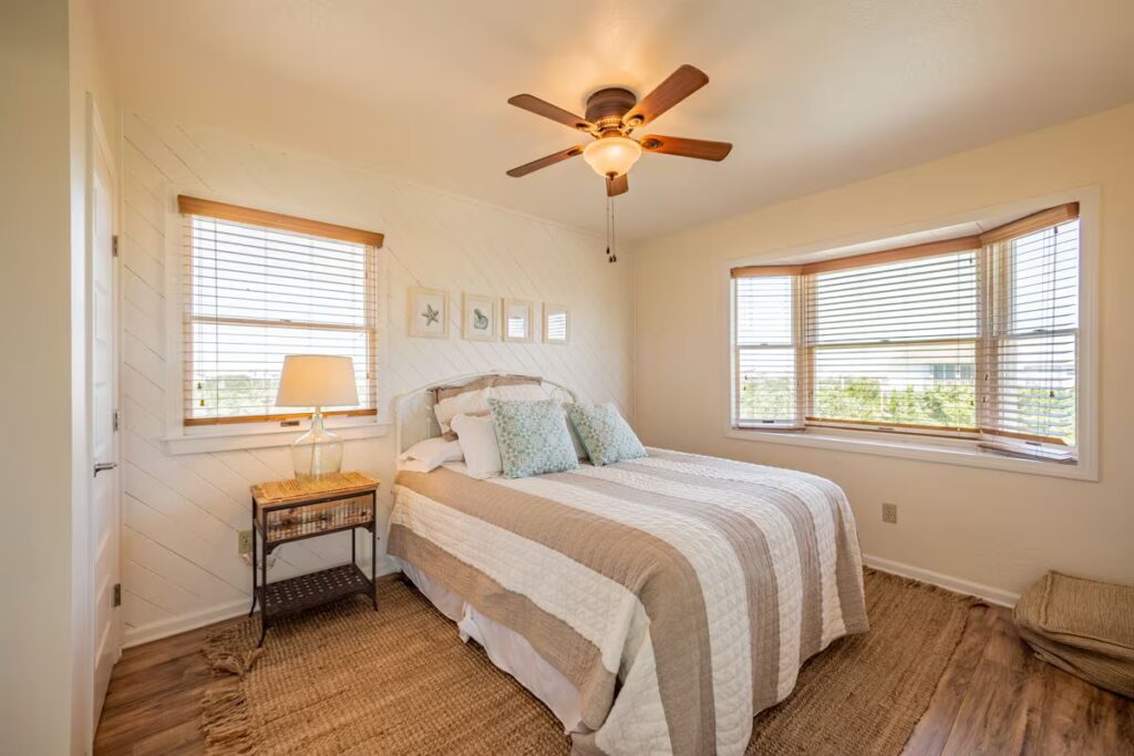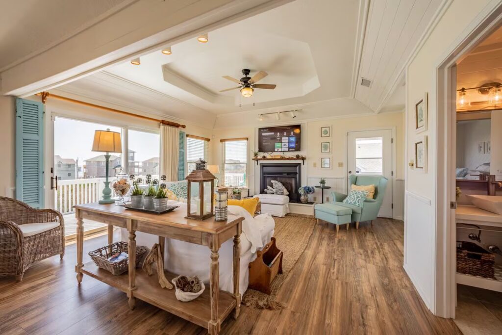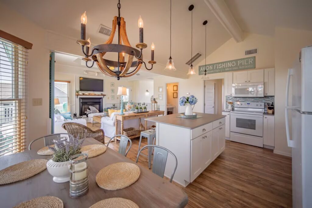 The second level features three additional bedrooms a queen room, a queen pull-out, and a twin room along with a full bath and another wraparound deck. A cozy entertainment area with a smart TV, games, and puzzles adds extra space to unwind. Outside, guests can enjoy a manicured yard, shuffleboard, cornhole, and an 8-person hot tub. Beach access is directly across the quiet street, and the Avon Fishing Pier, restaurants, and grocery stores are all within a short walk.
