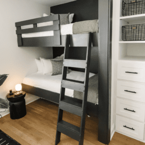 Upstairs, the primary suite includes a king bed, double-vanity bathroom, and a private balcony overlooking the Gulf. The guest suite features a queen bed, built-in bunks, and its own private bathroom.