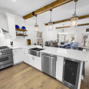On the second floor, you’ll find a king master suite with a private patio, a queen bunk room that sleeps eight, twin hallway bunks, and a shared hall bath. Each bedroom on this level offers outdoor access for quiet moments in the breeze.