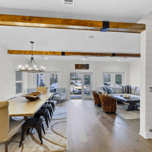 The first floor features an open and inviting layout with a spacious living area, a fully equipped kitchen, and a dining space perfect for group meals. A king guest bedroom and a full hall bath complete this level.