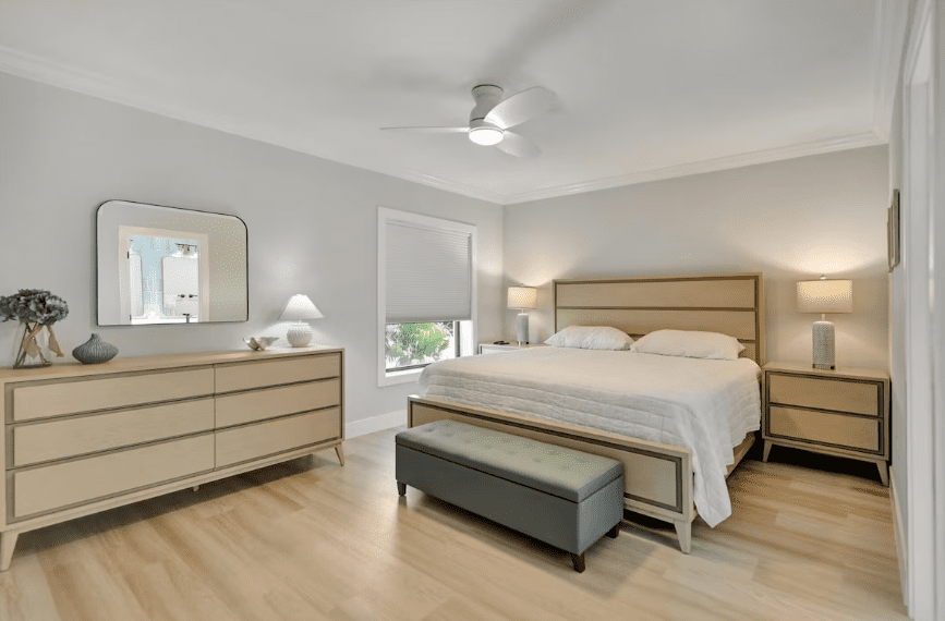 Located just 150 steps from the Gulf of Mexico, Coquina 3C is a beautifully remodeled 2-bedroom, 2-bath ground-floor condo offering a bright and comfortable retreat close to Sanibel’s best beaches and attractions. The interior features a spacious living area with a smart TV, free WiFi, and direct access to a private lanai. The adjoining dining space includes a pass-through window to the fully equipped kitchen, and a full-size washer and dryer add everyday convenience. The primary suite offers a king bed and en-suite bath, while the guest bedroom features a queen and a twin bed with access to a second full bath.