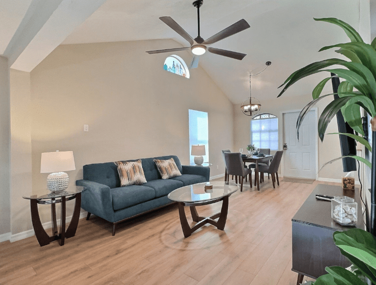 Inside, the home features an open and airy layout filled with natural light. The living room offers plush seating and a flat-screen TV, flowing seamlessly into the dining area and fully equipped kitchen. Stainless steel appliances, generous counter space, and sleek cabinetry make cooking and gathering easy, whether you’re preparing breakfast before the beach or dinner with friends.