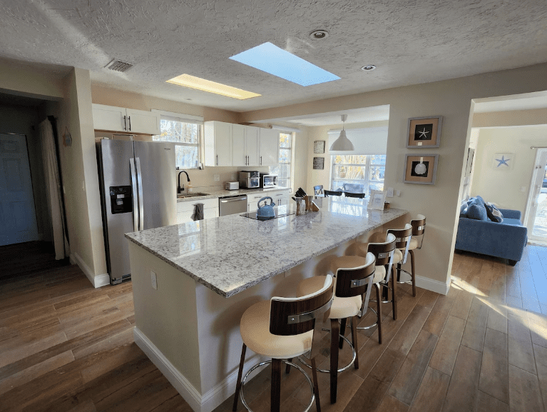 Sophie’s Cottage is a fully remodeled waterfront retreat designed for both relaxing couples getaways and easygoing family vacations. This bright and comfortable 2 bedroom, 2 bathroom home features a king bedroom, a queen bedroom, and two sleeper sofas (one queen and one full), each with gel foam mattresses to ensure a great night’s sleep. The dining room, living room, and den flow together for a spacious, open feel that makes gathering, lounging, or entertaining simple and enjoyable.