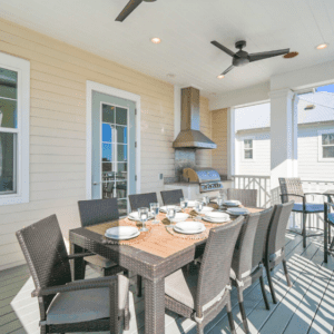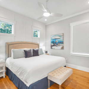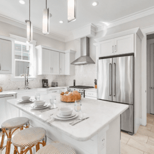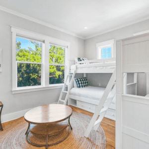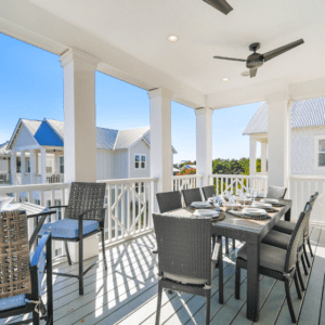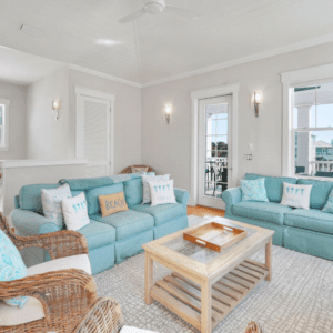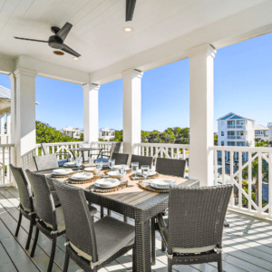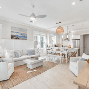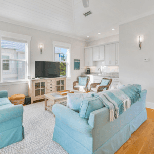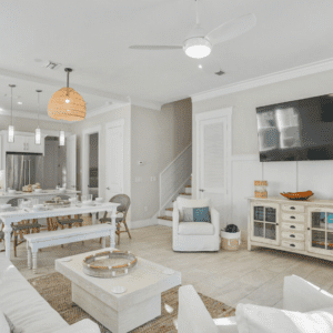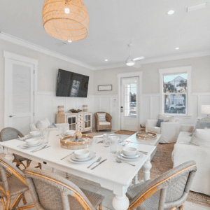 Someday Came is a bright and spacious three story beach home in Inlet Beach with room for up to twelve guests. The location is one of its biggest strengths since you are only a block from Wall Street beach access and a short bike ride from Rosemary Beach and 30A Avenue. Inside, the main living level has an open kitchen, dining, and living area with modern appliances and comfortable seating. It works well as the central hangout space after a day outside.