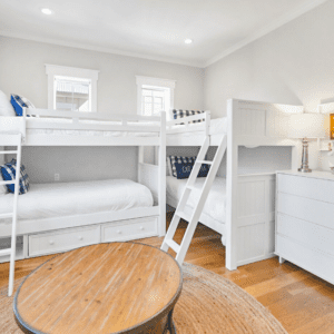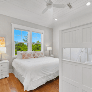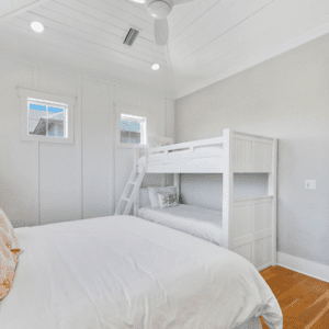 The top floor includes another living space with a wet bar and a fully furnished balcony that seats ten. It also includes an outdoor cooking area, so it becomes the spot for sunset dinners and laid back nights. Sleeping space is spread across all three levels. The ground floor has a king suite that sits just off the kitchen. The second floor has a large bunk room with two twin over twin bunks and a private bathroom. The third floor has a family suite with a king bed, a bunk, and an en-suite bathroom.