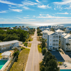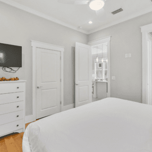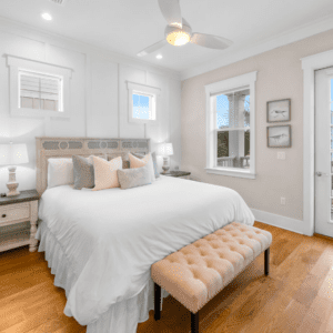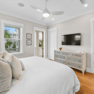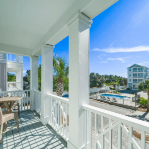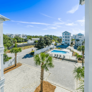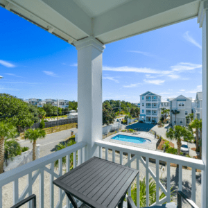 The private balcony king suite has views toward the beach and toward the community pool. With bikes, beach chair service, and an easy two minute walk to the sand, Someday Came is a simple and comfortable home base for an Inlet Beach vacation.