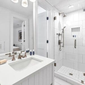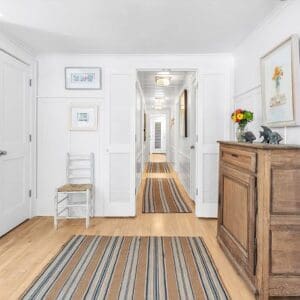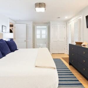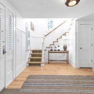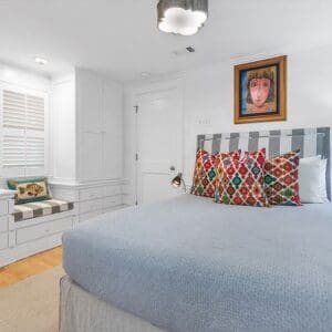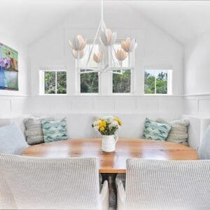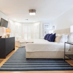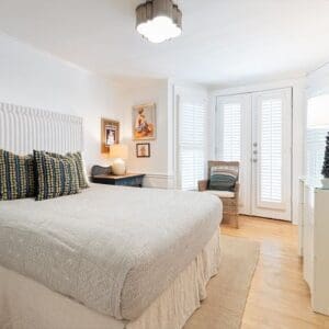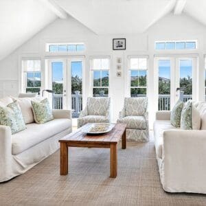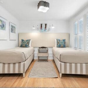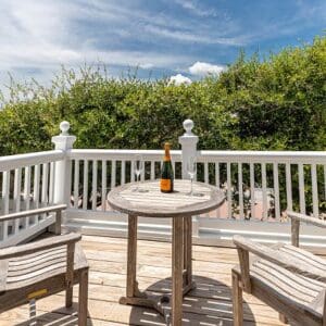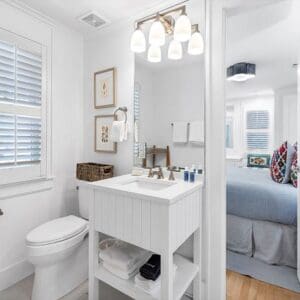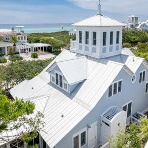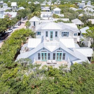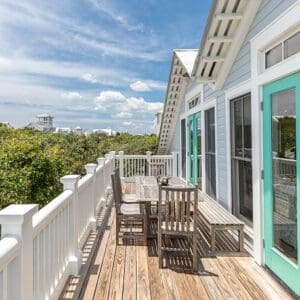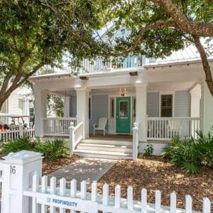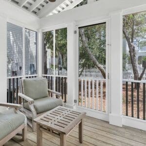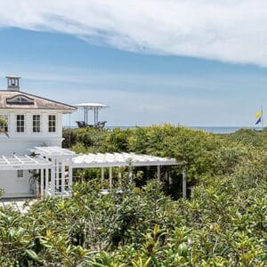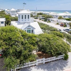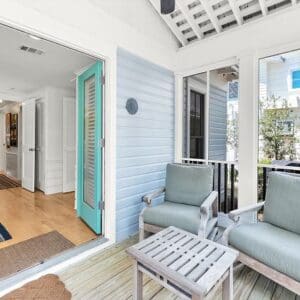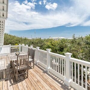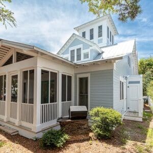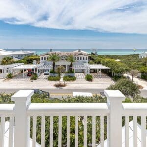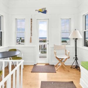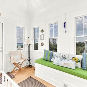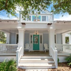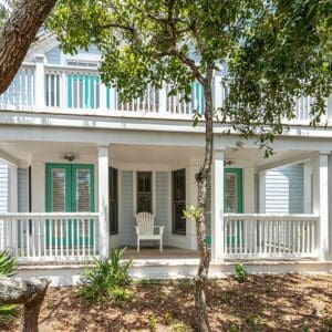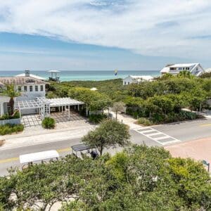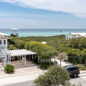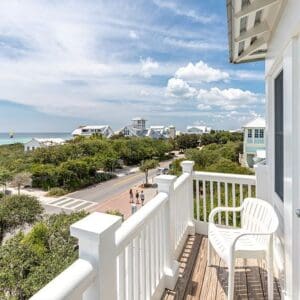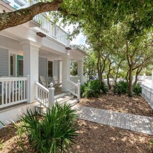 Splash is an updated four bedroom beach home in the heart of Seaside, sitting directly across the street from the Natchez private beach pavilion. The location is the entire play here. You walk out the front door and the sand is right there. The house has three king suites and a queen suite, all located on the main level for easy access. Two of the king rooms open to a tucked away verandah shaded by mature oaks. The primary suite sits in the back of the home with its own screened porch, which works as a quiet escape for early mornings or late nights.