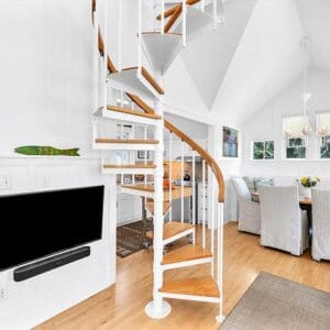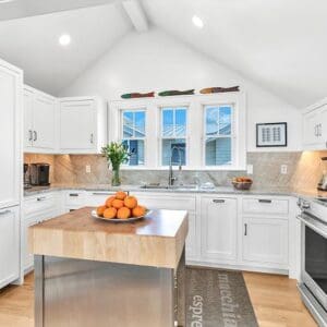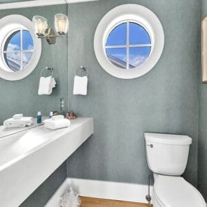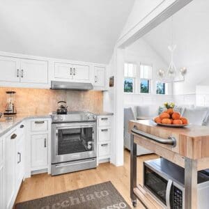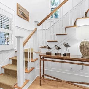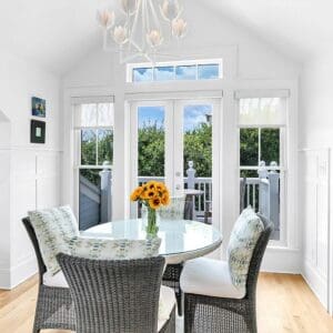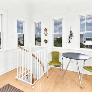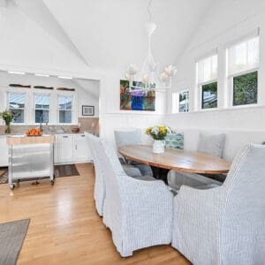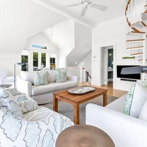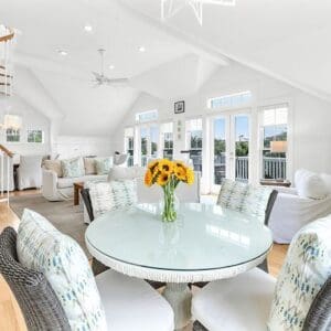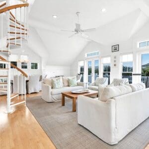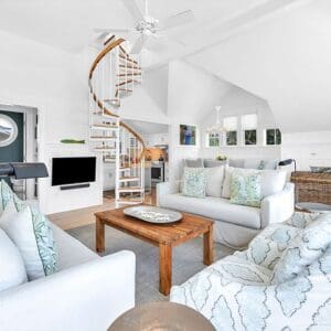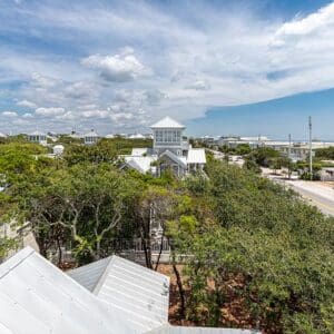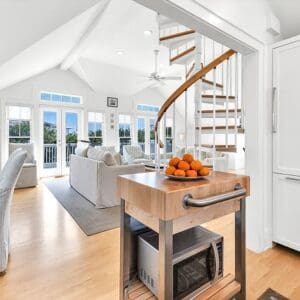 Upstairs, the second level is designed for gathering. The open living, dining, and kitchen layout has vaulted ceilings with exposed beams, natural light from tall windows, and coastal furnishings that feel clean and relaxed. The kitchen was fully remodeled with quartzite counters and high end appliances. A half bath sits off the living area. A spiral staircase leads to the third floor tower where you get panoramic views of town and the Gulf.