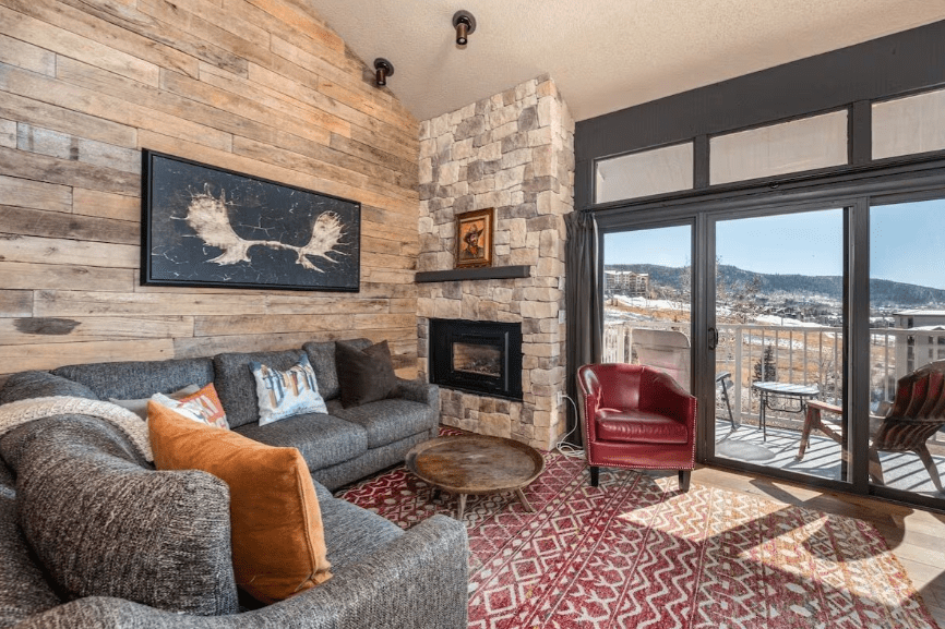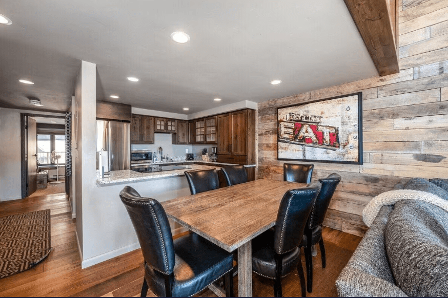 This fully renovated 3-bedroom, 2-bath top-floor corner condo sits in the heart of Ski Time Square, offering wraparound mountain views and unbeatable proximity to the slopes. The living area features vaulted ceilings, reclaimed barn wood accents, a stone fireplace, and a sleek modern kitchen with granite counters. Large windows and a wraparound deck bring in natural light and frame panoramic vistas of the Steamboat Ski Area and the South Valley. The dining area opens to the living space, creating a comfortable layout for unwinding after a day on the mountain.