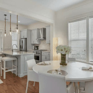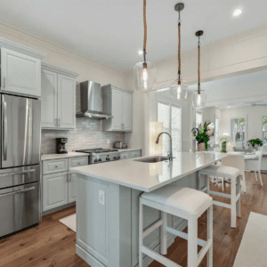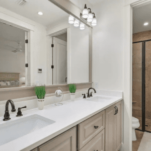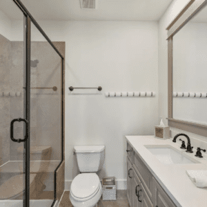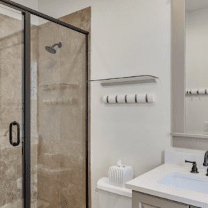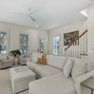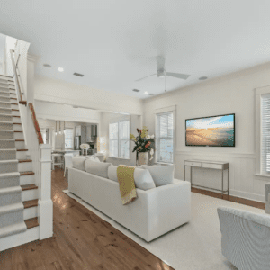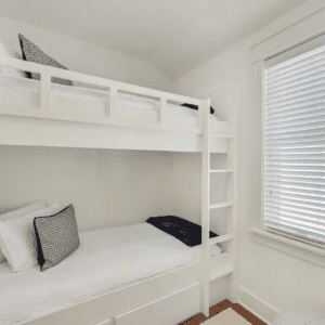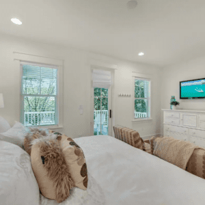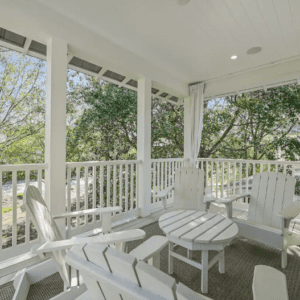 Upstairs, you’ll find a second primary suite with a private porch overlooking the neighborhood, plus 2 additional guest bedrooms each with their own bathrooms. A bonus living space on this level gives families and groups extra room to relax, watch movies, or spread out comfortably.
