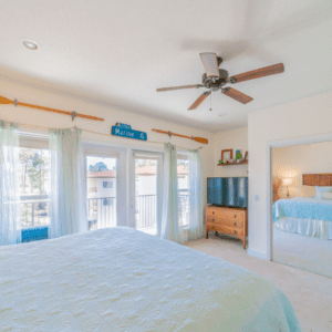 The layout is ideal for families or groups. The first floor offers a private master suite with a wet bar and screened porch only steps from the community pool. The second floor holds the main living space with a fully stocked kitchen, dining area, and comfortable seating for everyone. The third floor includes a second master suite with sweeping views and a spacious bunk room with its own bathroom.